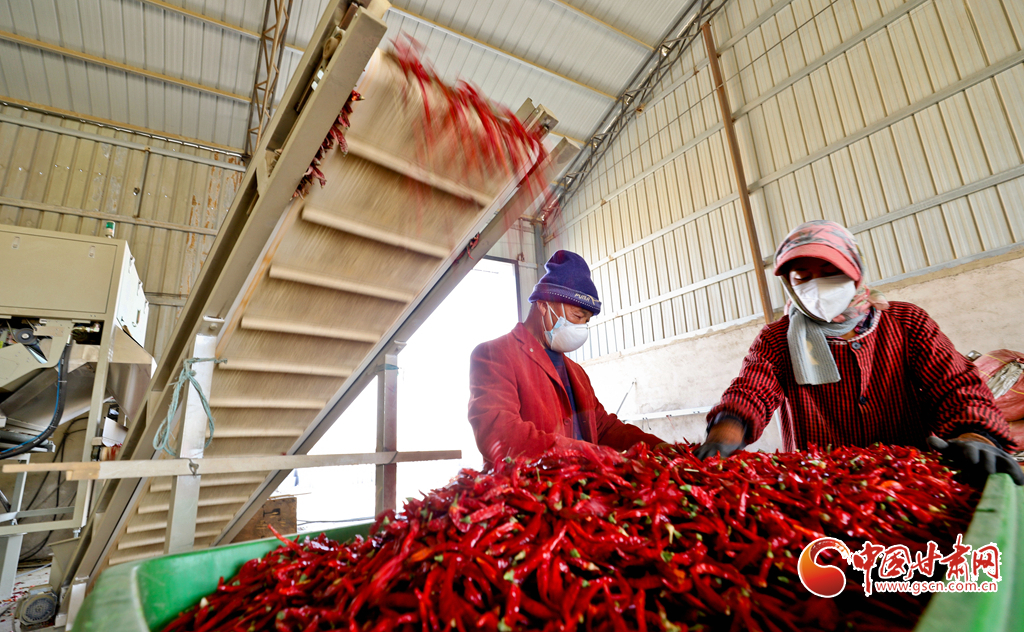 10月29日,张掖市临泽县新华镇胜利村辣椒加工厂内,工人们正在为河南、山东的客商加工500吨红辣椒干。