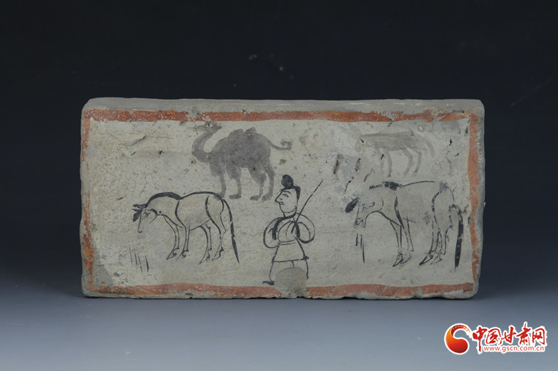 而在众多璀璨的壁画砖中,一件名为《牧马、骆驼图壁画砖》的馆藏一级文物,在美术界引发了强烈反响。这件壁画砖现收藏于高台县博物馆,画面中央绘有一位身着交领短衫、紧腰束带的牧人,他手执长鞭,正在悠然放牧。草地上,马群、骆驼、毛驴等牲畜或低头觅食,或悠然自得。