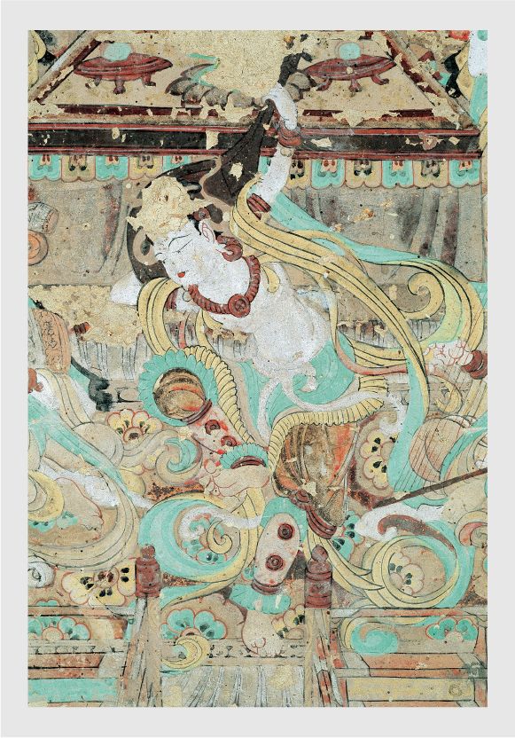 画面中的人物造型严格遵循唐代仕女的画风绘制,显得丰腴饱满,恰似盛唐时期雍容华贵的气质写照。线描写实明快,流畅飞动,一气呵成,仿佛是画师用灵动的笔触在墙壁上勾勒出的生命乐章。画面的颜色以石绿、赭黄、铅白为主色。整个画面显得典雅、妩媚,令人赏心悦目。虽然伎乐天头部原本贴金的头饰已经剥落,但岁月的痕迹并未减损她雍容华贵的气质,反而更增添了一份历史的厚重感。