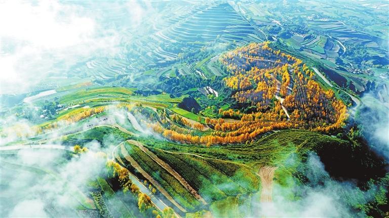 秋日的陇西县柯寨镇虎家屲村,云雾似轻纱裹满山峦,村落与林带隐入烟霭之间——黄土高原上世代耕耘出的“大地艺术”,正将自然意趣与烟火温情,晕染成一帧秋日的水墨诗行。