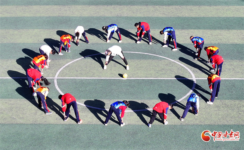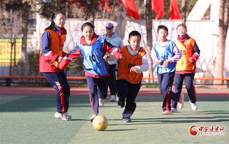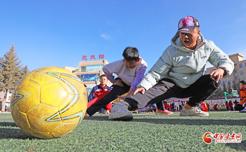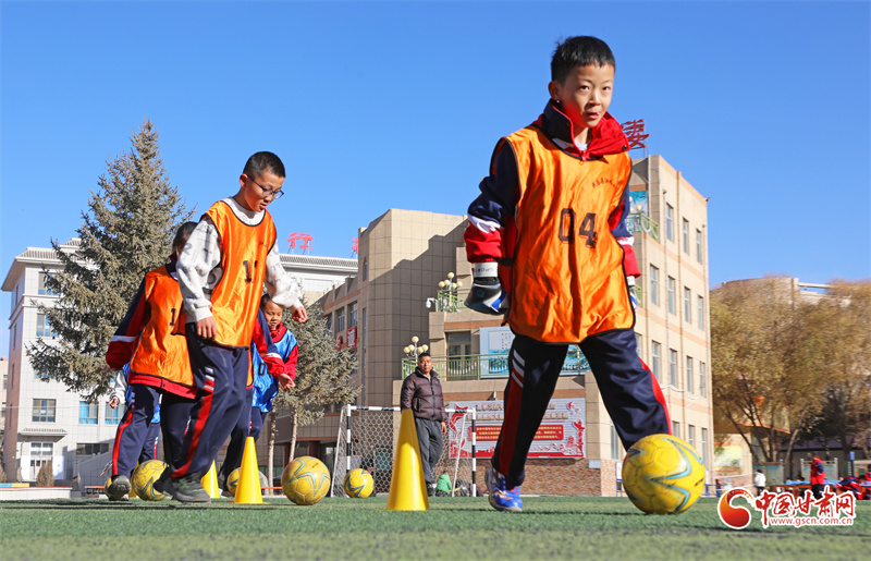 11月11日,在张掖市民乐县洪水小学的足球场上,学生们在进行足球训练。