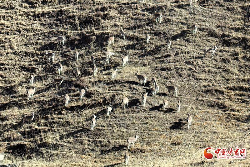 近日,民乐县大河口自然保护站扁都口资源管护站人员于高海拔区域日常巡护时,邂逅一大群岩羊在山坡觅食、奔跑的珍贵场景,岩羊数量约50只。