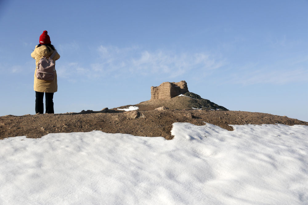 游客在雪后的甘肃省敦煌市阳关景区拍照游览。新华社发(张晓亮 摄)