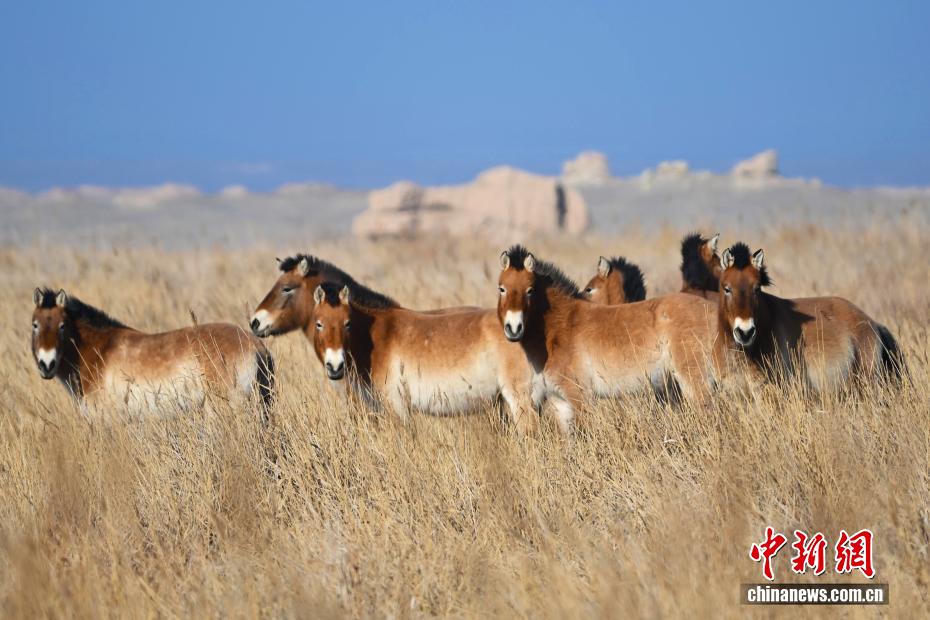 甘肃敦煌西湖国家级自然保护区自2010年启动普氏野马野化放归工作以来,目前种群数量达212匹,已从试验性野化放归阶段过渡到自由生活的野生种群阶段,实现完全依靠自身能力在野外繁衍生息,呈现自我维持和增长趋势。普氏野马有着6000万年进化史,在中国一度接近野外灭绝。1985年,中国启动“野马返乡计划”,先后数次从英国、德国、美国引进普氏野马进行繁育保护,逐步恢复和重建普氏野马野生种群,一步步为它们搭建“回家之路”。普氏野马野化放归成效显著,不仅使普氏野马重新在故土建立起可自我繁衍的野生种群,还促进植物群落更新和物质循环,为整个生态系统注入活力。图为1月8日,在甘肃敦煌西湖国家级自然保护区内拍摄的普氏野马。