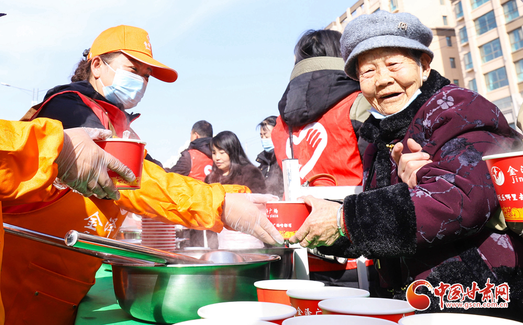 3月3日,张掖市临泽县金泽广场上,志愿者们给群众煮元宵。