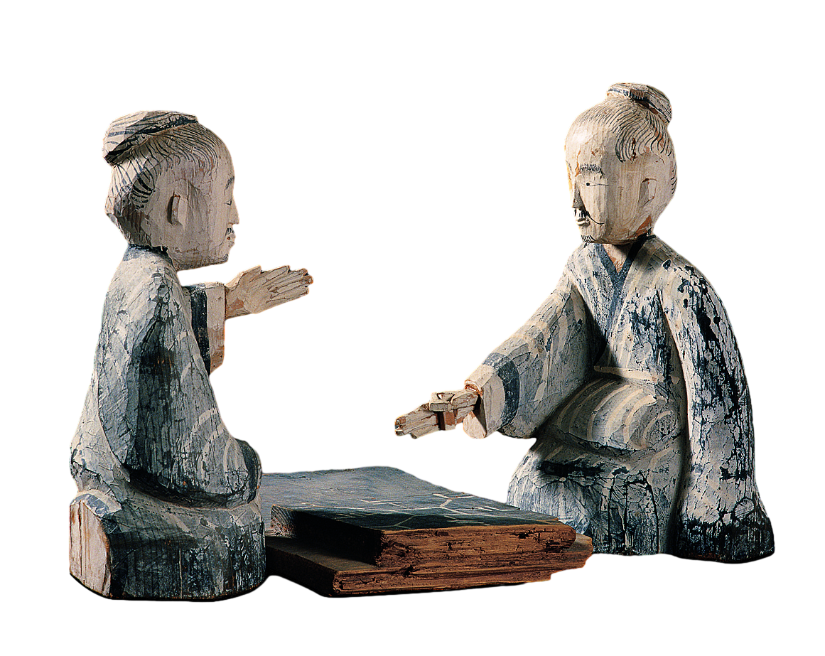 汉代 武威市磨嘴子汉墓出土 人高29厘米。 两位老者在玩博戏,这是战国到汉代非常盛行的一种娱乐形式。匠师以简单明快的艺术造型,刻画了两位老者全神贯注的博弈,惟妙惟肖地表现出对弈时蓄势待发的场面。