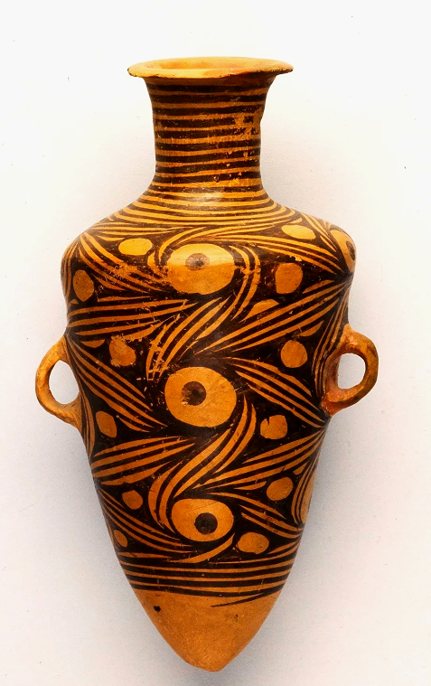 马家窑文化马家窑类型(距今4800年前)陇西县吕家坪出土高26.8厘米,口径7.1厘米。施黑彩,颈部绘平行条纹,肩、腹部绘四方连续漩涡纹。