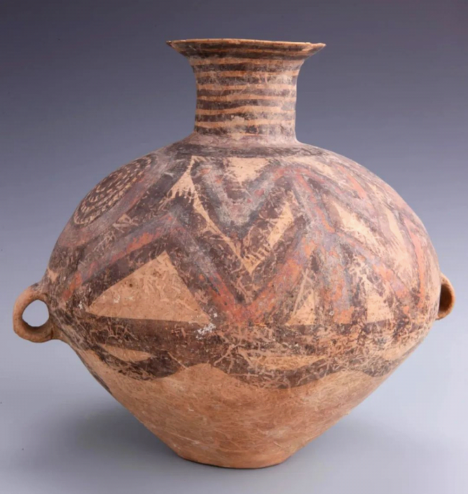 彩陶蛙纹壶,新石器时代马家窑文化马厂类型,高42厘米,口径13.1厘米。壶泥质红陶,口外侈,薄唇,球形腹,小平底,腹部两侧对称置双系。于橙红色陶衣上以黑彩描绘变形蛙纹。图案线条流畅,富于变化,与造型协调一致。据科学测试,马家窑文化马厂类型彩陶的年代约为公元前2200~前2000年。变形蛙纹作为马家窑文化马厂类型彩陶上常见的装饰纹样之一,体现了远古人们对于繁衍生殖的渴望。青蛙产下许多卵,孵出许多蝌蚪,正是繁衍旺盛的象征。