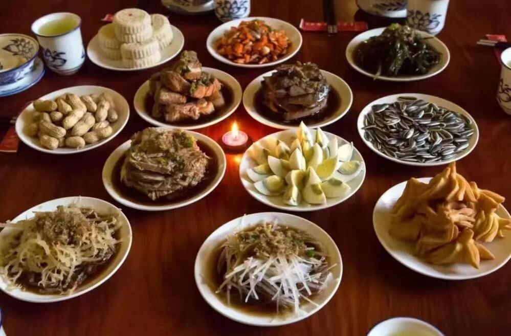 ——十二个佐酒碟子,皆取材自黄土田园,寓意十二地支,天人合一;摆放法为左骨、右旋,左鸡、右肝,左十香、右苴列,左鹿角、右带丝,上花生、下瓜子,左上角红炉、右下角白炉,中间为全盘。
