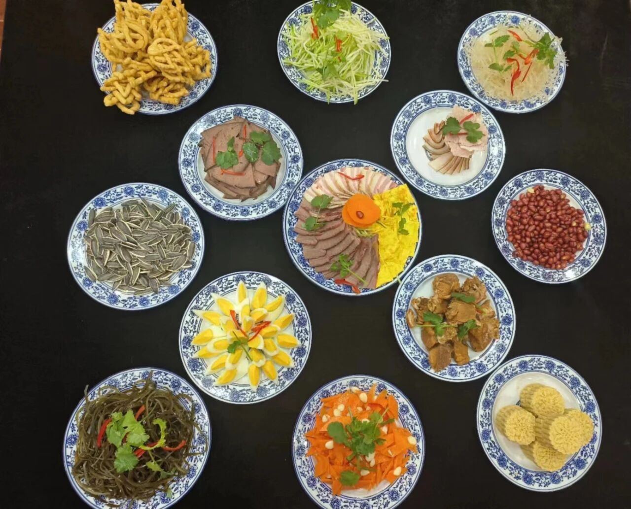 以常见的“十三花”为例,“十三花”,即十二个佐酒凉菜,加一旋菜全盘。整体具有太阳花或旋转八卦意象,遂美称为“花”。