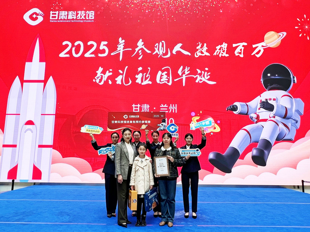 10月8日下午,甘肃科技馆迎来2025年度第100万名观众,打破了该馆建馆以来年度到访观众的历史记录。来自兰州市七里河区的四年级学生梁佳瑄与家人一同走进甘肃科技馆时,意外成为该馆本年度第100万名幸运观众,获赠“终身免预约参观券及纪念证书”以及科普实验大礼包,成为该馆发展历程中的标志性见证者。